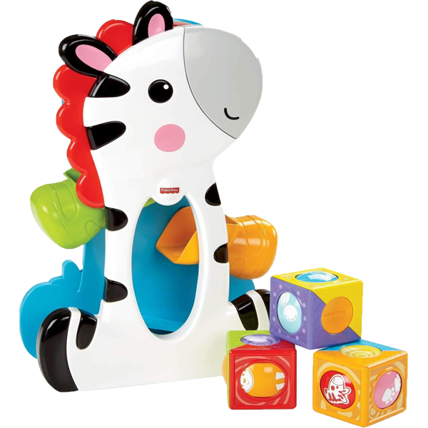 El bebé también puede apilar bloques de rodillos en la cabeza de la cebra.