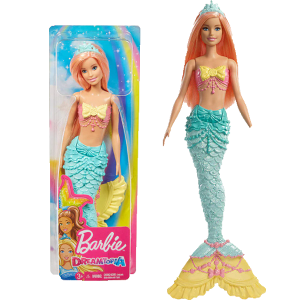 ¡Todo es posible con Barbie! La muñeca sirena Barbie Dreamtopia presenta una hermosa cola con decoraciones coloridas y acentos fantásticos inspirados en su reino natal de Rainbow Cove. El look de sirena único incluye la exquisita cola de sirena, acentos de temática marina y un tocado extraíble para su colorido cabello. Se dobla por la cintura para que puedas balancear su cola hacia adelante y hacia atrás para "nadar" en el mar o sentarla para que brille bajo el sol.