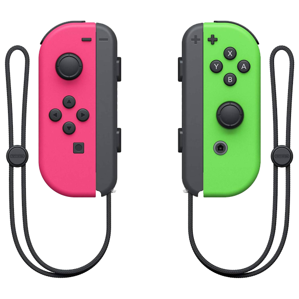 un Joy-Con izquierdo rosa neón, un Joy-Con derecho verde neón y dos correas