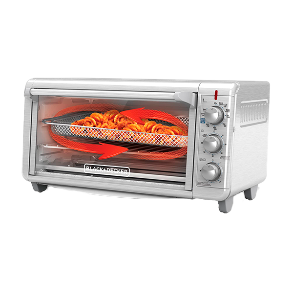 Presentamos la Tecnología para Freír con Aire, una tecnología nueva en el Horno Extra Ancho con Función para Freír con Aire de Black & Decker. ¡Disfrute del sabor de alimentos fritos en aceite abundante sin la grasa! La tecnología para freír con aire usa aire caliente de alta intensidad para hornear, dorar y crujir sus alimentos fritos favoritos con poco o ningún aceite. Pruebe las papas fritas, papitas fritas de vegetales, filetes de pescado empanizados, meriendas congeladas y ¡mucho más!