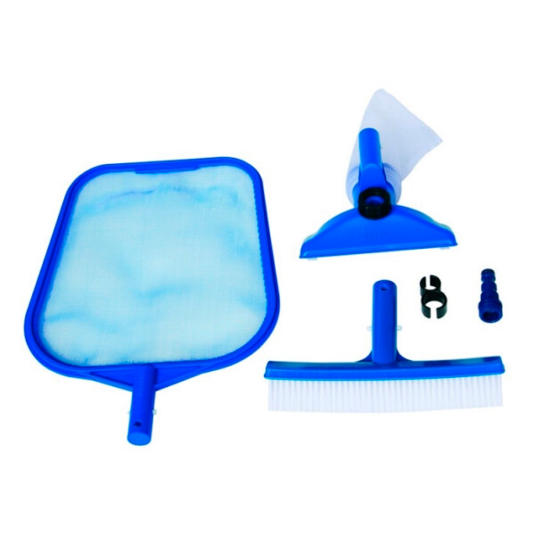 un cepillo recto para limpiar paredes y suelo, una red recoge hojas y un cabezal de aspiradora con bolsa reutilizable