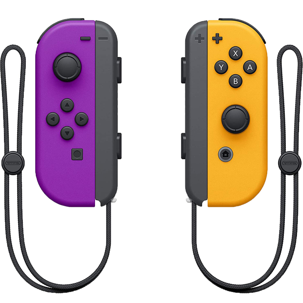 Set compuesto por un mando Joy-Con morado neón (Izquierda), un mando Joy-Con naranja neón (Derecha) y dos correas.