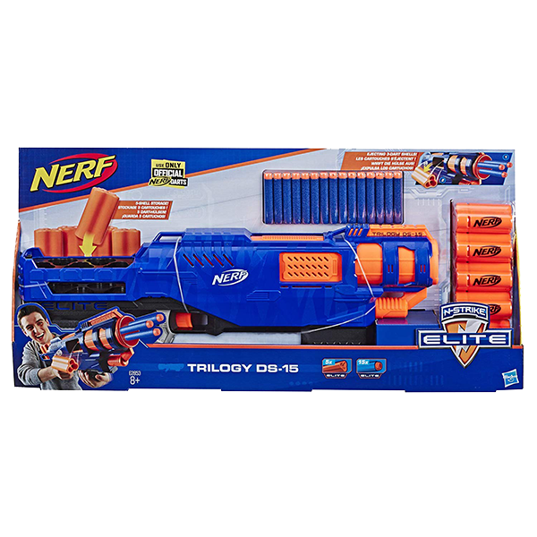 El lanzador de juguete Trilogy DS-15 tiene cartuchos expulsables que agitarán tus batallas Nerf. Lanza un tiro triple con este lanzador que lanza 3 dardos a la vez con cada cartucho. Cuando preparas otro lanzamiento, el cartucho vació sale expulsado automáticamente del lanzador. Este lanzador N-Strike Elite carga 1 cartucho a la vez y puede guardar 5 cartuchos en la culata para recargar más rápido. El lanzador viene con 5 cartuchos y 15 dardos Nerf oficiales, los suficientes para llenar los 5 cartuchos. Coloca 3 dardos en el cartucho, introduce el cartucho completo en el lanzador, jala el mango para preparar y presiona el gatillo para lanzar. Cuando cargas otro cartucho y jalas el mango para preparar, el cartucho vacío salta del lanzador. Los dardos Nerf Elite oficiales son diseñados para alcanzar grandes distancias, probados y aprobados para un alto rendimiento y calidad, y hechos de espuma con puntas flexibles y huecas.