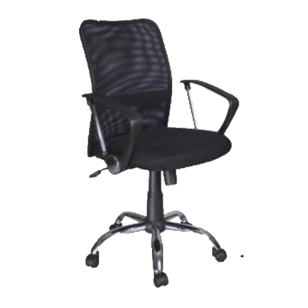 Silla semiejecutiva en malla negra con descansabrazos ajustables y soporte lumbar.