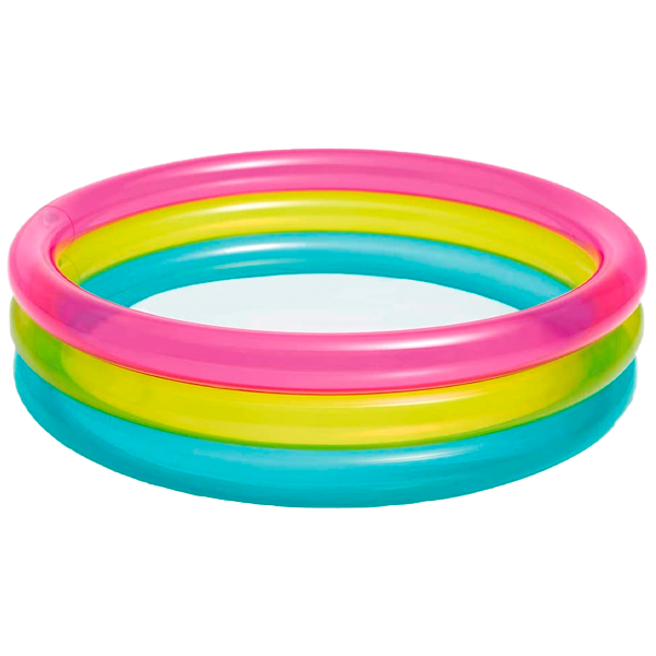 • Fabricada de vinilo resistente, tiene 3 aros transparentes y de diferente color: rosa, amarillo y azul.